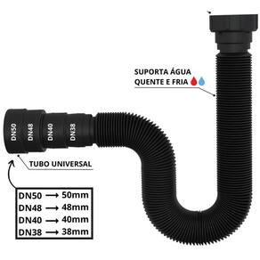Sifão sanfonado universal 73cm preto O sifão sanfonado universal é um acessório essencial de encanamento, projetado para se adaptar a qualquer saída de válvula de pia e a qualquer tubulação de esgoto, independentemente de seu tamanho ou tipo. Além disso, o sifão sanfonado corrige possíveis desalinhamentos entre a cuba e a tubulação de despejo, evitando assim a formação de bloqueios e obstruções que possam causar vazamentos ou refluxo de água suja. Esse acessório é ideal para tanques, pias e cubas em banheiros, cozinhas e lavanderias. Ele também é resistente a altas temperaturas, suportando água fria e quente até 90c, o que o torna adequado para ser em qualquer tipo de ambiente. Este sifão é compatível com tubos e conexões de 38, 40, 48 e 50mm, garantindo uma instalação fácil e segura, sem necessidade de ferramentas especiais. Ele é feito de plástico abs de alta qualidade, o que o torna resistente a rachaduras, corrosão e vazamentos, garantindo sua durabilidade ao longo do tempo. Em resumo, o sifão sanfonado universal é uma solução confiável e prática para quem procura um acessório de encanamento que seja fácil de instalar e que possa se adaptar a diversas situações de encanamento. Sua capacidade de corrigir desalinhamentos e impedir o retorno de mau cheiro da tubulação de esgoto torna-o uma escolha inteligente e eficaz para garantir a segurança e higiene em sua casa ou negócio. O produto segue montado e pronto para instalação Especificações técnicas Material: polipropileno Entrada para válvula polegada : 7/8 Saída para tubos e conexões: 38, 40, 48 e 50mm Modelo: para pias, cubas, tanques, lavatórios e válvula americana Suporta temperatura até: 90 graus Cor: preto Acabamento: brilhante Manual de instalação: sim Itens inclusos 01 sifão 01 adaptador universal Marca: Não Informado