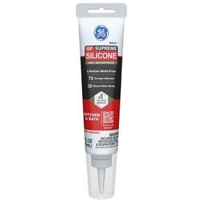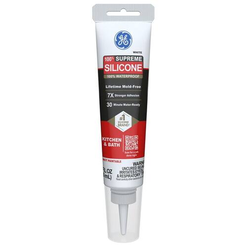 GE Calafetagem de silicone Supreme para cozinha e banheiro, branco, tubo de 83 ml, 1 pacote - selante de silicone 100% impermeável, adesão 7x mais forte, à prova de encolhimento e rachaduras