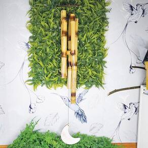 Este modelo em Bambu possui elementos naturais, possui 5 tubos de 25cm a 43cm.Possui uma Lua na ponta para energizar com mais potência.Possui gancho anel para pendurar em qualquer lugar, como varandas, pátios, janelas e etc.