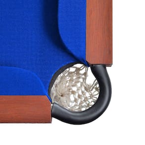 Mesa de sinuca com medidas semioficiais 2,20x1,20m confeccionada em madeira maciça cedrinho em tom de mogno, campo de jogo em pedra ardósia polida e tapeçada com tecido acrílico Thais na cor azul, modelo com 04 pés, caçapas em redinhas e pés niveladores para melhor nivelamento da mesa.