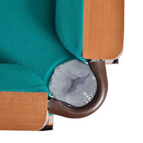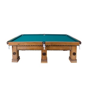 Mesa de sinuca com 6 pés e campo de jogo em pedra ardósia 3,5 cm de espessura e confeccionada em madeira maciça com prancha de 4 cm de espessura, tapeçada em lã na cor verde e borracha Tavares.
