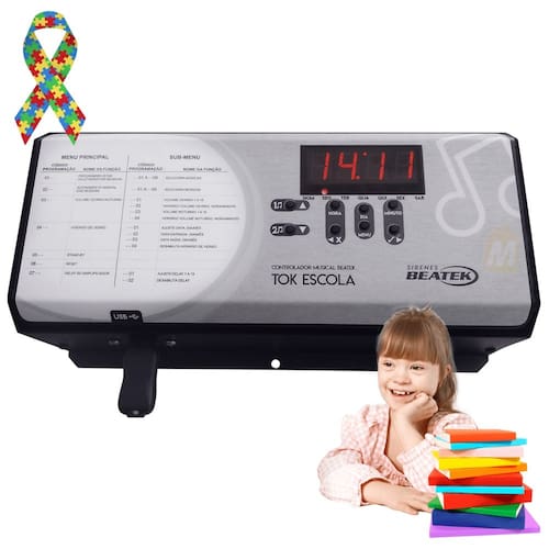Conheça a Sirene Musical Escolar Tok Escola Beatek! Um equipamento que permite melhorar o ambiente escolar e o tornar mais agradável para os alunos. O Tok Escola acompanha um pendrive (que pode ser personalizado) com 09 músicas pré-gravadas e chega pronto para uso! O som das músicas nas trocas de turno e/ou períodos torna a sua escola mais divertida, mais produtiva e mais inclusiva, pois é mais agradável aos ouvidos dos mais sensíveis, como as crianças com TDAH e Down.