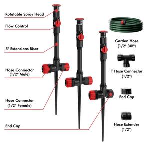 - ?Lista de embalagem?Este conjunto de pulverizadores de arco ultra flexível inclui: 3 irrigadores ajustáveis de 360°, riser de 7,6 x 12,7 cm, 3 x 9 m 1/5.1 cm, 1 conector de mangueira de 3 vias, conector de mangueira macho de 3 cm. 2 x 1/1 Conector de mangueira de rosca fêmea de 5 cm, 1 extensor de mangueira de 1,27 cm, 2 tampas de extremidade.