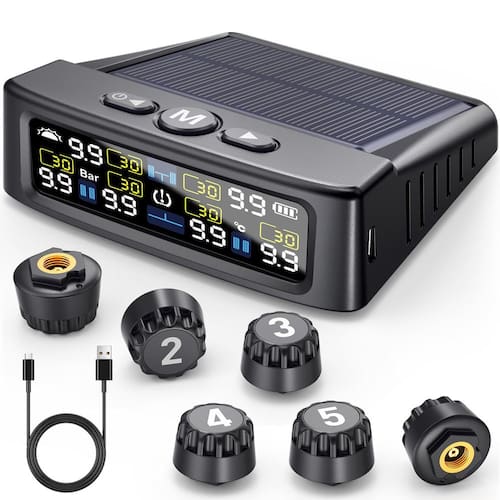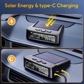 -?Carregamento solar e carregamento USB?O sensor de pressão de pneu GEARGO tpms oferece duas opções de carregamento convenientes. Equipado com um painel solar de bateria de lítio, ele carrega de forma autônoma sob a luz do sol, garantindo a vida útil contínua da bateria. Além disso, ele pode ser complementado pelo carregamento USB tipo C quando a luz solar não está disponível. Esses métodos de carregamento duplo aprimoram o sistema de monitor de pressão de pneu GEARGO tpms com 6 sensores TPMS externos, estendendo seu tempo de espera para uma usabilidade prolongada.
