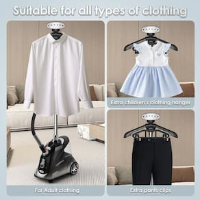 - ?Adequado para todos os tipos de tecido?- sistema de vaporização de roupas potente, altamente eficaz e suave remove vincos e rugas de suas roupas como ternos, jersey, blusa, vestido de noiva ou ótimo para itens domésticos como roupa de cama, toalha de mesa, guardanapos, tecido de sofá, cortinas e muito mais. Os acessórios incluem cabide infantil e suportes para calças, adequados para saias, roupas infantis pequenas e calças, etc.