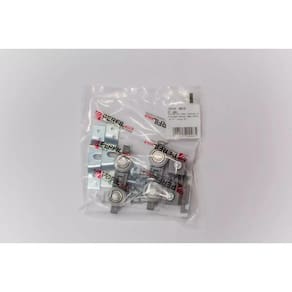 01 par de roldanas 4r convexa 28 mm com rolamento de plástico 02 parafusos centrais de repuxo 5/16 x 2 cabeça sextavada 02 porcas 5/16 01 arruela garra 02 chapa elevada 02 freios convexa 02 trava plástica preta 06 parafuso 3,5 x 25 mm zincado 01 guia inferior de plástico 01 chave de regulagem zincada 01 manual de instalação