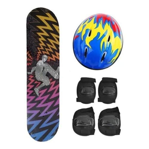 Skate Infantil Com Kit De Proteção e Bolsa estampas variadas Estampa: Skatista Skate Infantil com lixa e Kit de proteção é uma ótimo para trazer mais diversão para as criança e proteção na prática das manobras, assim arrasando na pista de skate. - ITENS INCLUSOS: 1 Skate 1 Capacete 1 par de Joelheira 1 par de Cotoveleira - ESPECIFICAÇÕES: Material: Madeira, lixa adesiva e vinilKit de proteção plástico e tecido Crianças a partir de 6 anos.Peso máximo suportado 50 Kg - MEDIDAS : Skate: 79,0 x 20,0 x 9 cmCapacete 22 x 18,5 cmJoelheira 15,5 x 12 cmCotoveleira 13,5 x 10 cm Escolher a estampa que deseja antes de finalizar a compra
