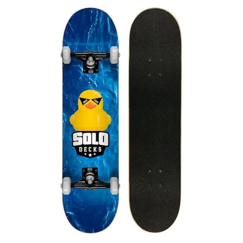Skate Montado Profissional Solo Decks Duck - Até 120Kgs Medidas Aproximadas: Nose: 17,7 cm / Tail: 16,7 cm / Wheelbase: 35,5 cm / Largura: 19,5 cm / Comprimento: 80,9 cm Construção do Shape: Composição especial com 7 lâminas selecionadas e bitoladas na mesma espessura Truck Solo Decks liga de aluminio 129 mm Amortecedores Lixa inclusa e já colada Roda Solo Decks Poliuretano 53 mm / Dureza 95A Abec 1 Parafuso Phillips Porca N°8 Alta resistência e leveza Excelente acabamento Peso aproximado: 2,200 Kg Desenho do shape aplicado no papel Produto Nacional ATENÇÃO: É recomendado o uso de equipamentos de segurança Marca: Solo Deck'S Ean: 7899858510921