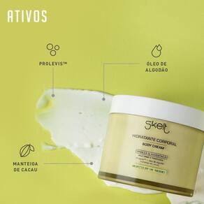 Firma a pele, deixando-a suavemente perfumada e macia. Com efeito tensor, ele uniformiza a textura da pele de forma perceptível desde a primeira aplicação. Sua fórmula conta com o poder do prolevis, que oferece efeito tensor, firmeza e suavização perceptíveis logo na primeira aplicação. O óleo de algodão é um ingrediente que possui ação antioxidante e auxilia na redução dos processos inflamatórios e a manteiga de cacau possui ação emoliente que deixa a pele macia e ainda auxilia no combate de radicais livres e envelhecimento cutâneo. O que ele faz Possui ação protetora e firmadora promove efeito tensor imediato pele macia e tonificada instantaneamente unexpected day a unexpected day é uma fragrância que proporciona vigor e energia, desenvolvida para pessoas ambiciosas que sabem onde querem chegar Resultado: hidratante Sugestões de uso: após o banho, com a pele limpa e seca, aplique o produto diariamente sobre todo o corpo e massageie suavemente até a completa absorção pela pele; 2. Reaplique sempre que desejar. Observações: imagem meramente ilustrativa Itens inclusos: 1 skelt prolevis skelt skin & body care body cream unexpected day creme hidratante corporal 200g
