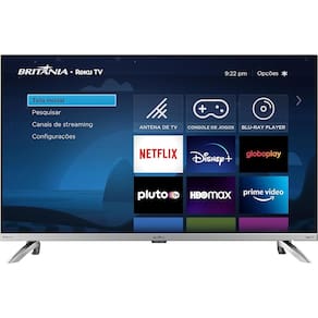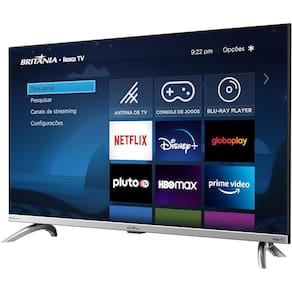 A Fast Smart TV Britânia BTV32G7PR2CSBLH de 32 polegadas conta com um incrível desempenho, graças ao seu processador Quad Core e processador gráfico Triple Core. Juntos, eles proporcionam maior velocidade para o conteúdo dos aplicativos e uma performance ideal para o seu televisor.Além disso, a TV Britânia oferece diversas opções de conectividade, como hdmi e usb, permitindo que você conecte seus dispositivos favoritos e reproduza com alta qualidade suas imagens, vídeos e músicas.Outra vantagem da Fast Smart TV BTV32G7PR2CSBLH é o sistema de som Dolby Digital que transmite o som do filme ou vídeo reproduzido em 5.1 canais, proporcionando uma experiência de áudio imersiva e realista.A Smart TV vem com diversos aplicativos pré-instalados, incluindo o Globoplay e o YouTube, que oferecem conteúdo variado para toda a família. Já o app mobile é outra ótima opção para a tv, pois permite que você transforme seu smartphone em um controle remoto para a tv.Por fim, a Fast Smart TV Britânia BTV32G7PR2CSBLH também oferece um sistema de busca inteligente multicanal para você encontrar seus filmes, séries e canais favoritos de maneira fácil e rápida. Modelo: BTV32G7PR2CSBLHGarantia (Dias): 360Funcionalidades: Wifi: SimLoja de Aplicativos: SimNavegador (Web Browser): NãoSmart tv: SimBluetooth: NãoEspelhamento de tela: MidiacastAplicativos instalados:NetflixYoutubePrime VídeoDisney +Conexão com Alexa: SimGoogle Assistente: SimImagem:Tamanho da tela: 32Áudio: Dolby Audio: SimDolby atmos: NãoCanais: 2.0Surround sound: NãoEqualização de Som: SimPotência do alto-falante: 10Wrms x 2Reprodutor de áudio Bluetooth: NãoConexões: Wi-Fi Direct: NãoEntrada hdmi: 2Entrada usb: 1Entrada (av): SimEntrada P2: 1Entrada de vídeo e áudio estéreo (rca): SimEthernet (lan): 1Saída Digital Óptica: 1Informações Técnicas: Cor: Silver (prata)Sistema OperacionalRoku tvProcessador: QuadcoreConversor digital integrado: SimPotência: 24,7Alimentação de energia: ac 100-240V 50/60HzConsumo médio (w): 24,7Itens Inclusos: Controle RemotoCabo de forçaManual de instruçõesBase (Pés)
