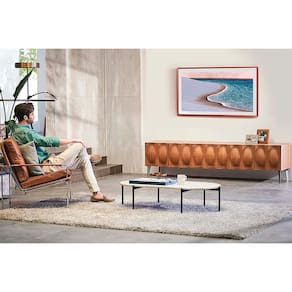 Para integrar ela ainda mais à decoração, o Modo Ambiente combina a The Frame com o seu espaço. Basta que você selecione uma das texturas pré-definidas na TV, ou tire uma foto dela já na parede, para que ela se adeque à sua sala, ao invés de ficar exibindo uma tela preta, quando desligada.