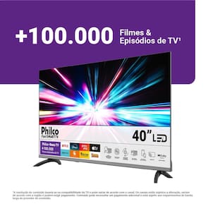 - Smart TV 40" Full HD Philco P40CRA - Tamanho da Tela: 40” - Resolução: Full HD (1920 x 1080) - Sistema Operacional: Roku TV - Frequência: 60Hz - HDR: HDR10 - Áudio: 20W RMS (2 x 10W RMS) - Tecnologia de Som: Dolby Audio - Wi-Fi Integrado: Sim - HDMI: 2 entradas - USB: 3 entradas - Entrada LAN (RJ-45) - Entrada RF para TV aberta - Saída Digital Óptica - Dimensões com base (LxAxP): 890 x 550 x 185 mm - Peso com base: 4,92 kg - Cor do Produto: Space Gray - Cor da Base: Preta - Furação VESA: 200 x 200 - Voltagem: BivoltTamanho da tela