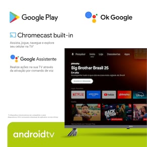Com o sistema operacional Android 11, a TV oferece navegação rápida e acesso aos principais aplicativos já instalados, como Netflix, Prime Video, YouTube, Disney+ e Apple TV. Além disso, o Chromecast integrado facilita o espelhamento direto do seu smartphone.