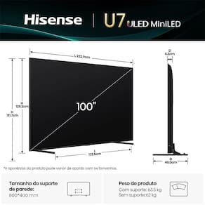 Tecnologia MiniLed, Resolução 4K, Tela de 100 polegadas, Wi-Fi, Bluetooth, 4 Entradas HDMI, 2 Entradas USB, Entrada LAN, Subwoofer Embutido, Dolby Vision IQ, Suporte Vesa 800x400 mm, Frequência de 144 Hz.Vendido e entregue por FAST SHOP