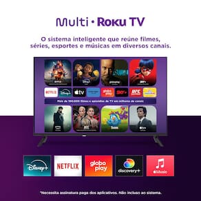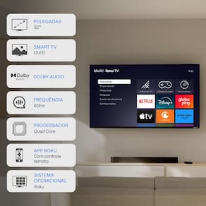 Smart TV DLED 32 HD Multi Essencial Roku 3HDMI 2USB Wi-Fi, com Alexa, Siri e Google Home. Tela DLED com definição HD, áudio com padrão de qualidade Dolby. Espelhe a tela do seu smartphone Android ou iOS diretamente na televisão para curtir qualquer conteúdo. Controle a smart TV pelo controle remoto ou celular.Vendido e entregue por Multi Oficial