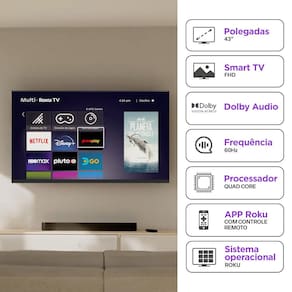 Smart TV DLED 43 polegadas Full HD com sistema operacional Roku TV. Compatível com assistentes de voz (Alexa, Google Home) e espelhamento de tela. Áudio Dolby Audio. Conectividade Wi-Fi e Bluetooth 5.0. Possui 3 HDMI (1 ARC), 2 USB, AV, Ethernet, saída óptica e P2. Controle remoto com botões de acesso rápido. Controle via aplicativo Roku.Tamanho da tela