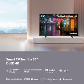 A Toshiba e sinonimo de qualidade, durabilidade e inovacao. Com a Smart TV DLED 55 Pol. Toshiba 4K, voce investe em tecnologia, conforto e uma experiencia de entretenimento completa para toda a familia.