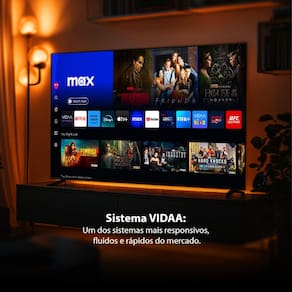 Smart TV DLED 65 4K Toshiba 65C350NS VIDAA com 4 HDMI e 2 USB. Sistema operacional VIDAA, Wi-Fi integrado, Bluetooth 5.0. Resolução 4K, taxa de atualização de 60 Hz. Brilho de 300 cd/m² e contraste de 1400:1. Suporte VESA 300x400. Consumo médio de 160W.