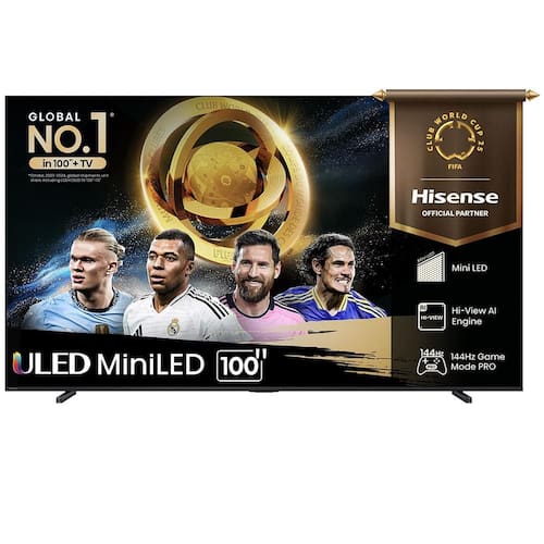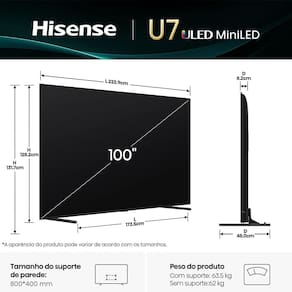 Tecnologia Mini LED Ultra LED, Resolução 4K, Sistema Operacional Hi-View AI Engine, AI Sound, Dolby Atmos, Google, Recursos para Games, AI Picture, AI Scenario, AI Energy, Suporte VESA 800x400 mm.Vendido e entregue por FAST SHOP