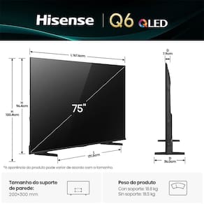 A Smart TV Hisense 75Q6QV de 75" oferece uma experiência envolvente e incrível de entretenimento na sua casa. Equipada com o sistema VIDAA U9, a TV 75Q6QV proporciona uma navegação rápida, intuitiva e fácil acesso aos seus conteúdos favoritos. Com a tecnologia avançada Dolby Vision, HDR, HDR10, HDR10+, HLG, Filmmaker Mode, Dolby Gaming, desfrute de alta qualidade de imagem e combinado ao Dolby Atmos, desfrute de um áudio imersivo de alta qualidade, ideal para filmes, jogos e esportes. Com Modos dedicados para games e esportes garantem uma visualização aprimorada, enquanto o controle que pode ser acionado por voz facilita seu dia a dia. Além disso, é possível espelhar a tela de dispositivos móveis para a TV através do Miracast, ampliando as opções de visualização e entretenimento. Compatibilidade Alexa e Google, permite integração na sua casa inteligente. Descubra o mundo de possibilidades com a Smart TV Hisense 75Q6QV, combinando design elegante com desempenho excepcional para uma experiência de visualização superior.