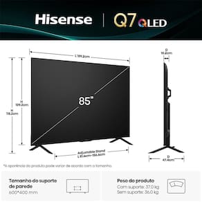 A Smart TV Hisense 85Q7QG de 85" oferece uma experiência envolvente e incrível de entretenimento na sua casa. Equipada com o sistema Google TV, a TV 85Q7QG proporciona uma navegação rápida, intuitiva e fácil acesso aos seus conteúdos favoritos. Com a tecnologia avançada Dolby Vision, HDR, HDR10, HDR10+, HDR10+ Adaptative, HDR+ Gaming, HLG, Dolby Vision IQ, Dolby Gaming, Filmmaker Mode, , desfrute de alta qualidade de imagem e combinado ao Dolby Atmos, desfrute de um áudio imersivo de alta qualidade, ideal para filmes, jogos e esportes. Com Modos dedicados para games e esportes garantem uma visualização aprimorada, enquanto o controle que pode ser acionado por voz facilita seu dia a dia. Além disso, é possível espelhar a tela de dispositivos móveis para a TV através do MiraCast, ampliando as opções de visualização e entretenimento. Compatibilidade Alexa e Google Home, permite integração na sua casa inteligente. Descubra o mundo de possibilidades com a Smart TV Hisense 85Q7QG, combinando design elegante com desempenho excepcional para uma experiência de visualização superior.