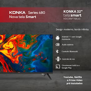 A Konka apresenta a você o nosso novo lançamento::Tela Smart serie 680Completa em todos os sentidos!Controle por voz e inteligência artificialCom o controle remoto minimalista e multifuncional, é possível controlar a sua Tela Smart com comandos de voz. Abra aplicativos, execute comandos, altere configurações, tudo de maneira simples e intuitiva.Google ChromecastO Google Cast built in é uma tecnologia que oferece experiências em diversas telas e permite a você espelhar e controlar conteúdos como vídeos, de um dispositivo como smartphone, tablet ou laptop, por exemplo, para a sua Tela Smart Konka KDG32.HDR 10: Imagens com cores vivas e incríveis.Vivencie cada detalhe ao assistir vídeos em resolução HD sendo capaz de perceber todo e qualquer detalhe.O sistema HDR “High Dynamic Range”, presente na Smart Tela Konka KDG32, é responsável pela quantidade de cores que cada pixel pode assumir. Esse formato é capaz de deixar a imagem do televisor com excelente resultado de brilho e contraste, já que as imagens ficam com cores mais vivas, os tons mais claros possuem mais brilho e os tons pretos, mais contraste. O resultado são imagens mais realistas e uma melhor experiência para o espectador!Alto desempenhoNavegue entre os aplicativos sem lentidão ou travamentos, o processador CA55 possui 4 núcleos de processamento, o que permite a você executar várias aplicações sem nenhum problema.O sistema idealA Tela Smart Konka Serie 680 vem equipada com o sistema operacional mais popular do mundo: o Android. Com uma loja de aplicativos repleta de milhares de aplicativos compatíveis prontos para serem instalados e utilizados.Tudo fica melhorMúsicas com som de alta qualidade, filmes e séries com imagens em HD e TV ao vivo em alta definição, a sua disposição com a Tela Smart Konka KDG32.Design modernoCom a borda infinita, a imersão é total. Sinta-se dentro da cena quando estiver assistindo os seus programas prediletos. A tecnologia frameless (sem bordas) permite a você o aproveitamento de 100% da tela.Conexão sem limitesConecte-se a internet de alta velocidade graças ao adaptador wireless dual band. Ela está pronta para redes 2.40Ghz e 5.0Ghz. Com a Tela Smart Konka KDG32, você jamais terá que esperar seus vídeos ficarem carregando. Além da wifi de alta velocidade, você ainda conta com conexão Bluetooth para que possa conectar gadgets como caixas de som, soundbars, etc.Solta o som!Dois potentes com alto falantes estéreos com simulação surround acompanham a sua Tela Smart Konka KDG32, pois uma imagem perfeita merece um áudio sensacional.E ainda tem mais, acredita?São tantos recursos que uma funcionalidade muito importante quase escapou. Ela também é uma TV, né gente? A sua Tela Smart Konka vem acompanhada de um conversor digital removível externo.Assista TV ao vivo em alta definição, acompanhe aquela novela, telejornais, enfim, são diversos canais a sua disposição.Agora, depois de descobrir tudo que a Tela Smart Konka KDG32 tem a oferecer, fica impossível não garantir a sua, não é?Garantia: 12 Meses para defeito de fabricação.