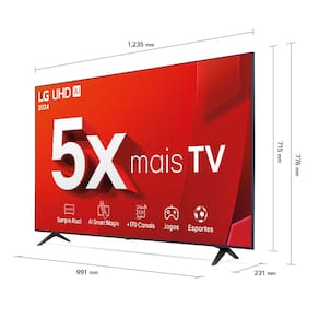 A nova TV Ultra HD 4K da LG exibe cores mais ricas, apresentando seu conteúdo favorito de forma mais vívida e natural. O processador a5 Ger7 aprimora a TV LG para proporcionar a você uma experiência imersiva. HDR10 / HLG, 4K Upscaling, webOS 24, AI Sound Pro, Bluetooth Surround Ready, Otimizador de Jogos, ALLM, HGIG, Wi-Fi 5, Bluetooth 5.0, 2.0 canais, 20W, 3 HDMI, 2 USB, 1 Entrada RF, 1 Ethernet, 1 Saída Digital Óptica, Furação VESA: 300x300.Infelizmente não temos estoque do produto que você está procurando no momento.