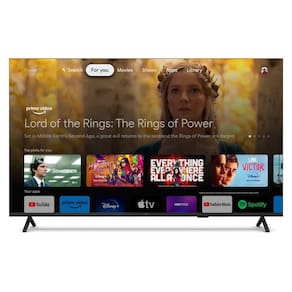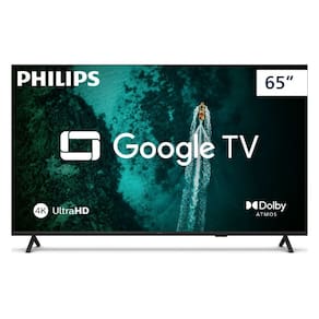 Smart TV Philips 65 polegadas com resolução 4K, Google TV, comando de voz, processador Quad Core, painel LED, design sem bordas, frequência 60 Hz, proporção de tela 16:9, ângulo de visão 178º, brilho 300 cd/m², taxa de contraste dinâmico 1:200.000, tempo de resposta 8 ms.