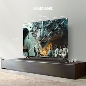 Tecnologia QLED, resolução 4K, brilho preciso e uniforme, cores vibrantes, detalhes nítidos. Google TV com acesso a mais de 400.000 filmes e séries. Dois alto-falantes de 8W RMS (16W RMS total). Controle parental. Integração com smartphone via espelhamento de tela. Controle remoto com comando de voz e botões de atalho.