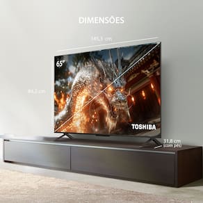 Smart TV QLED 65 4K Toshiba Google TV 4HDMI 2USB Wi-Fi, Google TV, Dolby Áudio com Dolby Vision Atmos, dois alto-falantes clear direct, controle parental, Espelhamento de Tela, AirPlay, Comando de Voz, Far Field Voice, Bluetooth 5.3, Wi-Fi, Bivolt, Navegador, Controle a TV com comandos de voz por meio do Google Home.
