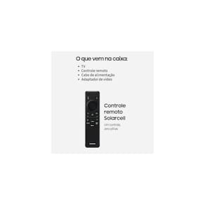 Resolução 4K UHD real, tecnologia avançada de ajuste de som e imagem, recursos modernos de conectividade, design sofisticado, Painel sem bordas, Modo Ambiente, Assistente de Voz Integrado, Controle SolarCell, Gaming Hub, Processador Crystal 4K, HDR, HDR10+, Mega Contraste, Micro Dimming, Motion Xcelerator, Bluetooth 5.2, eARC/ARC, Anynet+ (HDMI-CEC), USB-A, Ethernet (LAN), entrada RF, sistema de áudio de 20W RMS em dois canais, Tizen Smart TV, compatibilidade com assistentes de voz (Bixby e Alexa), Samsung TV Plus, Samsung Gaming Hub, Xbox Cloud Gaming, NVidia GeForce Now, espelhamento de imagem e som via smartphone, AirPlay, Auto Game Mode ALLM.Tamanho da tela