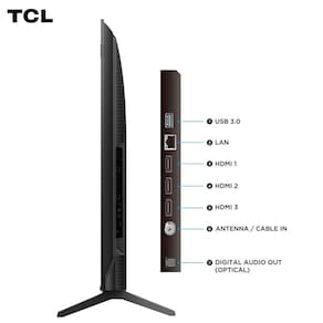 Conexões: 1 Porta LAN, 3 HDMI, 1 USB, 1 Entrada para Antena/cabo, 1 Saída Áudio digital (óptica)