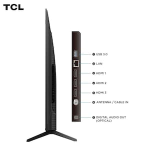 Conexões: 1 Porta LAN, 3 HDMI, 1 USB, 1 Entrada para Antena/cabo, 1 Saída Áudio digital (óptica)