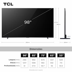 Transforme sua sala com a Smart TV TCL 98C6K 98” QLED Mini LED 4K, painel matte e Google TV para imagens incríveis e fluidez máxima com 144 Hz. Desfrute de apps como Netflix, Disney+ e Prime Video, comandos por voz hands-free e integração com Alexa. Tenha áudio potente 2.1 canais com subwoofer, HDMI 2.1 para games e recursos exclusivos para acessibilidade e crianças. Design sofisticado em preto, conectividade total e garantia de 12 meses TCL. Viva a experiência do cinema em casa com a TCL!
