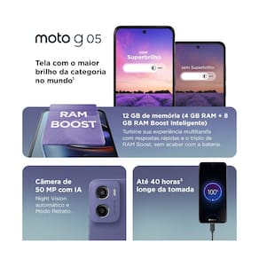 O Smartphone Motorola Moto g05 é o salto que faltava para sua produtividade. Se você procura um aparelho rápido, resistente e inteligente o Moto g05 é a opção ideal. Equipado com um display de 6,7 e recurso Superbrilho, sua tela garante cores profundas e um brilho que se adapta a diferentes tipos de iluminação ambiente. Alto Desempenho: 4GB RAM + 8GB Ram Boost. O Moto G05 é a combinação perfeita entre a velocidade do processador Helio G81 (2,0 GHz Octa-Core) e a potência da tecnologia RAM Boost que garante uma experiência multitarefa em tempo real. Grave, jogue e navegue nas redes sem preocupações! Durabilidade e acabamento premium. Seu revestimento em Gorilla Glass 3, entrega uma tela com superfície reforçada mais resistente à marcas e riscos. Enquanto, sua tecnologia Smart Water Touch, combinada com sua estrutura em Vegan Leather são pontos que conferem uma durabilidade excepcional ao Moto G05, tornando-o mais resistente à respingos de água. Até 40 horas longe da tomada. Sua bateria de 5.200 mAh oferece até 40 horas de autonomia para você aproveitar mais tempo longe das tomadas. Mas, com grandes baterias, também temos grandes carregadores. Por isso, ele acompanha um carregador rápido de 10W que garante uma recarga rápida e eficiente.