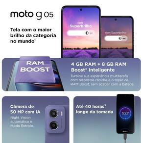 Smartphone Motorola Moto G05 4G 128GB 4GB RAM + 8GB RAM Boost Câmera Traseira 50MP Frontal 8MP Tela 6.7" Violeta + Ubook - Livros Digitais