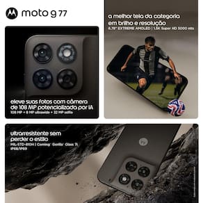Smartphone Motorola Moto G77 6.8” 256GB 5G Câmera Dupla 108MP. Eleva sua experiência com fotos de altíssima resolução, tela impressionante e desempenho veloz para o dia a dia! Tela Extreme AMOLEDA tela