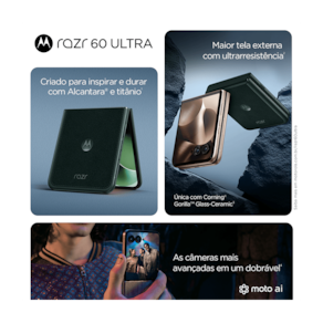 Maior tela externa com ultrarresistência: Única tela externa com Corning® Gorilla™ Glass Ceramic5: O motorola razr 60 ultra é o primeiro celular dobrável com Corning® Gorilla™ Glass-Ceramic. Com isso, a tela tem um desempenho 10x melhor em caso de queda5. É a tela externa mais forte de um motorola razr até hoje.
