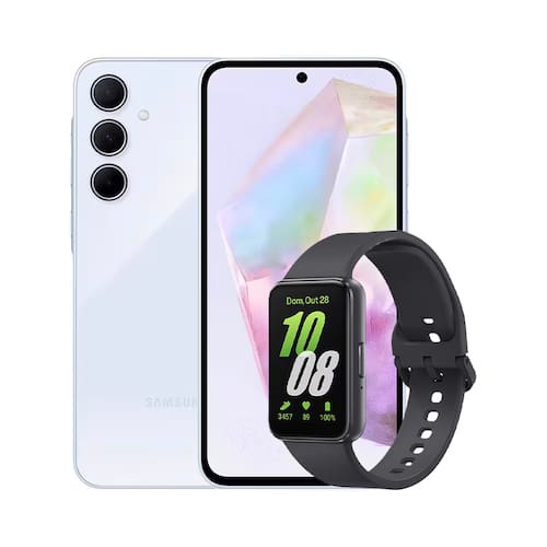 Smartphone Samsung Galaxy A35 5G Azul Claro 256GB, 8GB RAM, Câmera Tripla Traseira de até 50MP e Tela super AMOLED de 6.6" + Galaxy Fit3 Grafite