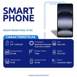 Rodando o Android 14 com a nova interface Xiaomi HyperOS, voce sente a diferenca na fluidez, no visual e nas funcionalidades inteligentes que se adaptam a voce e nao o contrario. O Redmi Note 14 5G chegou para transformar seu dia a dia em uma experiencia premium, do jeito que voce merece.
