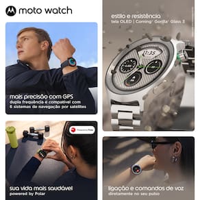 - Smartwatch Motorola Moto Watch XT2547 - Tela: OLED 1.4” - Resolução: 466 x 466 pixels - Proteção: Corning Gorilla Glass 3 - Compatibilidade: Android 12 ou superior - Software: Powered by Polar - Sensores: Acelerômetro, Giroscópio, Bússola, Luz Ambiente, PPG - Conectividade: Bluetooth 5.3 - Localização: GPS (L1+L5), GLONASS, BEIDOU, Galileo, NavIC, QZSS - À Prova d'água : IP68 - Capacidade da bateria: 450 mAh - Bateria: Até 13 dias (variável conforme uso) - Dimensões: 47 x 47 x 12 mmSim Card