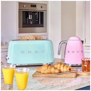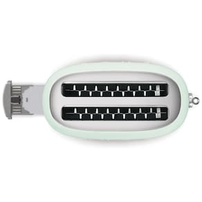 Torradeira Smeg de 2 fatias com 6 níveis de tostagem, funções de reaquecimento, descongelamento e bagel, bandeja de migalhas removível e desligamento automático.Permite ejeção manual