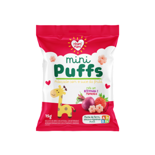 O Snack Infantil Mini Puffs Beterraba e Morango Nhami Mami é elaborado em conjunto com uma nutricionista infantil. Feito com poucos ingredientes, sem aditivos artificiais, equilibrados para fornecer energia e vitaminas para os pequenos.