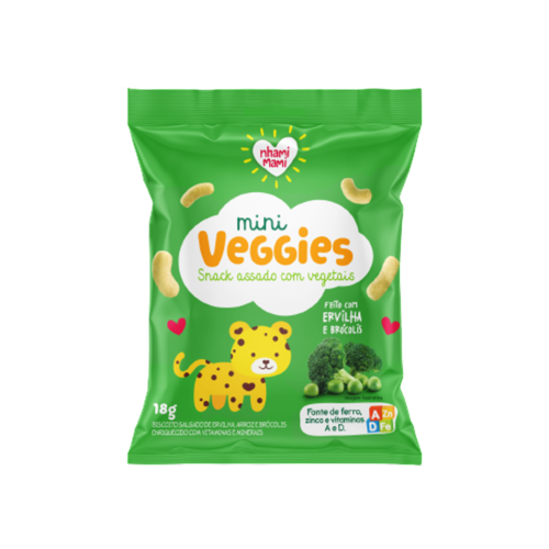Feito com ingredientes 100% naturais, integrais e sem gordura trans ou aditivos artificiais, o Snack Infantil Mini Veggies Ervilha e Brócolis Nhami Mami é perfeito para um lanchinho saudável e equilibrado.