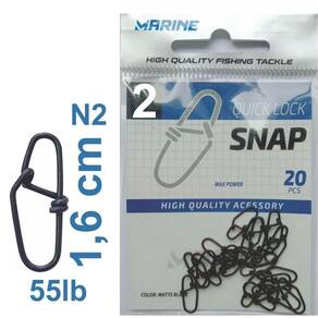 O Quick Lock Snap da Marine Sports é produzido em aço inox de excepcional força e resistência, acabamento em preto fosco e fechamento duplo, com duas voltas reforçadas, o que o torna mais robusto e adequado para os grandes predadores. Disponível em três tamanhos. O Snap da Marine Sports facilita e agiliza a troca de iscas e é o acessório perfeito para os pescadores apaixonados por praticidade e eficiência, este snap de pesca é ideal para diversas modalidades, desde a pesca em água doce ou em água salgada.