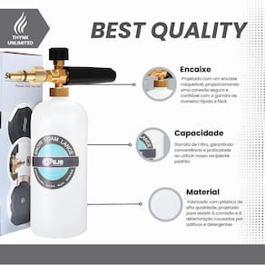 Compatível com diversas lavadoras de alta pressão Produz espuma densa para uma limpeza profunda Capacidade de 1 litro, ideal para múltiplas aplicações Facilita a remoção de sujeiras e contaminantes Perfeito para lavar veículos e superfícies externas Fácil de usar e eficiente em resultados profissionais