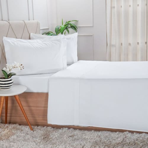 • Informações Adicionais: Branco Óptico, Bainha de 4cm, Costura Dupla, 150 Fios, 50% Algodão e 50% Poliéster, Costura reforçada para lavação Industrial