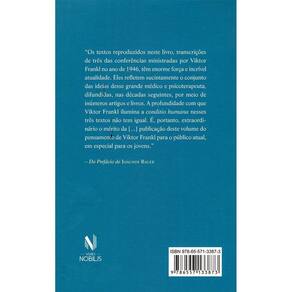 ?Os textos reproduzidos neste livro, transcrições de três das conferências ministradas por Viktor Frankl no ano de 1946, têm enorme força e incrível atualidade. Eles refletem sucintamente o conjunto das ideias desse grande médico e psicoterapeuta, difundidas, nas décadas seguintes, por meio de inúmeros artigos e livros. A profundidade com que Viktor Frankl ilumina a conditio humana nesses três textos não tem igual. É, portanto, extraordinário o mérito da [...] publicação deste volume do pensamento de Viktor Frankl para o público atual, em especial para os jovens.? Do Prefácio de Joachim Bauer.