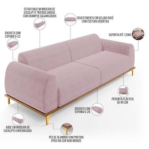 Com bastante idade e beleza ímpar o Sofá 03 Lugares Para Sala de Estar Kiev 210 cm D02 Veludo Rosê C-305 - Lyam Decor vem para requintar ainda mais sua decoração! Amplamente sofisticado, é ideal se você está buscando por uma peça elegante e confortável. Possui acabamento impecável, é estruturado em madeira de eucalipto tratada, unidas com grampos galvanizados, base envernizada e pés de alumínio com pintura epóxi na cor New Bronze que o tornam ainda mais atraente e convidativo.