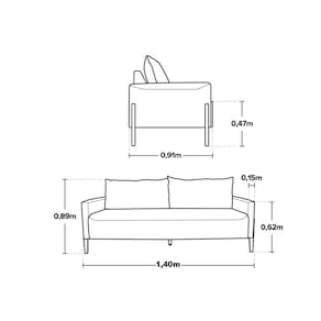MEDIDAS: Altura total: 89 cm Altura braço até chão: 62 cm Altura assento até chão: 47 cm Largura total: 91 cm Largura braço: 15 cm Comprimento: 140 cm